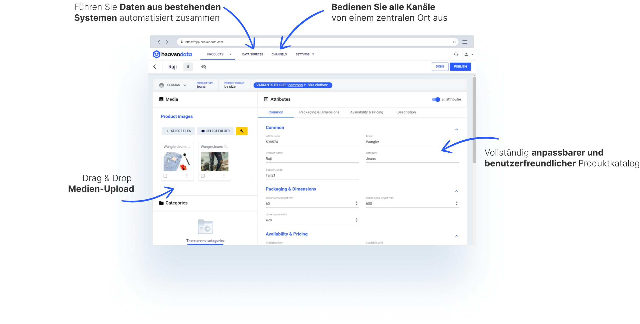 Ohne heavendata: Produktdaten mussten in mehreren Systemen und Excel-Dateien hochgeladen und bearbeitet werden. Mit heavendata: Ein zentrales, einfach zu nutzendes System verwaltet Produkt- und Mediendaten. Alle Teams und Kanäle erhalten stets aktuelle, hochqualitative Informationen.