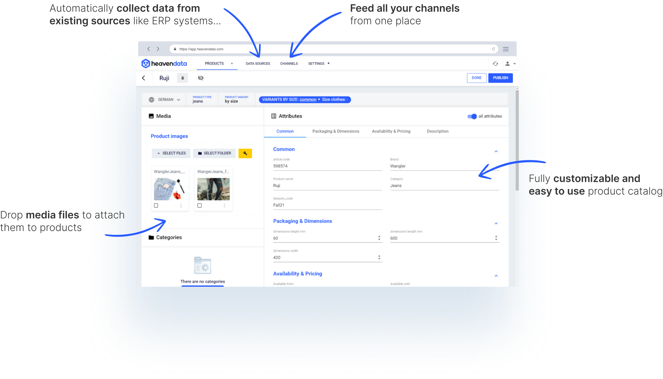 Before heavendata: Product data had to be uploaded and edited in multiple web interfaces and Excel files. After heavendata: There is ONE user friendly place to manage product data and media files. All teams and channels have always up-to-date high quality data.